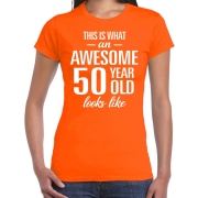 Awesome 50 year cadeau t-shirt oranje dames. Op dit oranje shirt staat groot de tekst: This is what an awesome 50 looks like. Sarah / 50 (vijftig) jaar shirt.  Leuk om cadeau te geven voor…