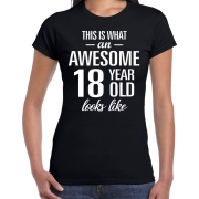Awesome 18 year - geweldige 18 jaar cadeau t-shirt zwart dames. Op dit zwarte shirt staat groot de tekst: This is what an awesome 18 year old looks like. ken jij iemand die binnenkort 18 (…