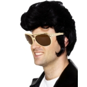Elvis verkleed set pruik zwart en gouden bril voor heren. Rock and roll ster uit de jaren 60. Pruik is gemaakt van syntetisch materiaal. De bril is het echte Elvis bril model. Jaren 50/60…