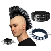 Punkers verkleedset voor echte mannen, bestaande uit een carnaval verkleed pruik, zwarte riem met studs samen met typische verkleed ketting met spikes. Voeg enkel nog het juiste jasje/broek…