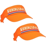 2x stuks oranje Koningsdag zonneklep met Nederlandse vlag. Deze oranje zonneklep / pet is bedrukt met een streep in de kleuren van de Nederlandse vlag en de tekst: Koningsdag. Draag deze…