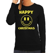 Foute kersttrui/sweater voor dames - Happy Christmas - zwart - glitter geel - Smile Emoticon L -