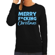 Foute kersttrui/sweater voor dames in de kleur zwart. De trui is bedrukt met blauwe glitter tekst: Merry F*cking Christmas. Deze leuke kerst trui is perfect om cadeau te geven of om zelf te dragen…