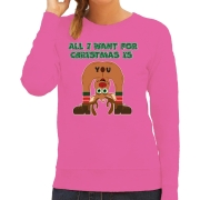 Foute Kersttrui/sweater voor dames - All I Want is - roze - blote kont - rendier - hilarisch S -