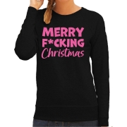 Foute kersttrui/sweater voor dames in de kleur zwart. De trui is bedrukt met roze glitter tekst: Merry F*cking Christmas. Deze leuke kerst trui is perfect om cadeau te geven of om zelf te dragen…