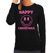 Foute kersttrui/sweater voor dames - Happy Christmas - zwart - glitter roze - Smile Emoticon L -