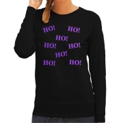 Foute kersttrui/sweater voor dames in de kleur zwart. De trui is bedrukt met paarse glitter tekst: Ho! Ho! Ho! Ho! Ho! Ho! Ho! Ho!. Deze leuke kerst trui is perfect om cadeau te geven of om zelf…
