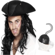 Piraat accessoires verkleedset zwarte driehoekige hoed en piratenhaak. Deze verkleedset is geschikt voor volwassenen. Dit artikel bestaat uit 1x Piratenhaak verkleed…