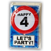 Happy Birthday kaart met button 4 jaar. Leuke verjaardagskaart voor een 4e verjaardag. Met stopbord button die de jarige zelf kan dragen.…