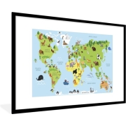 Poster in fotolijst kinderen - Kinderkamer decoratie - Wereldkaart - Kinderen - Dieren - Blauw - Groen - Poster wereldkaart - 120x80 cm - Wanddecoratie kinderkamers