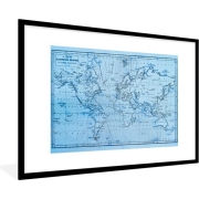 Fotolijst incl. Poster - Wereldkaart - Blauw - Lijnen - 120x80 cm - Posterlijst