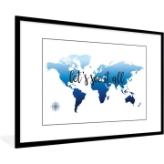 Fotolijst incl. Poster - Wereldkaart - Blauw - Kompas - 120x80 cm - Posterlijst