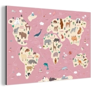 Wanddecoratie Metaal - Aluminium Schilderij Industrieel - Wereldkaart kinderen - Dieren - Aarde - Jongens - Meiden - Roze - 120x80 cm - Dibond - Foto op aluminium - Industriële muurdecoratie - Voor de woonkamer/slaapkamer