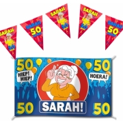 Set van 1x Sarah/50 jaar gevelvlag 100 x 150 cm en 3x vlaggenlijnen 10 meter -