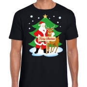 Foute Kerst t-shirt kerstman en rendier Rudolf zwart voor heren. Dit shirt is bedrukt met een afbeelding van een kerstman en rendier rudolf voor een kerstboom en de tekst Merry Christmas.…