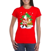 Foute Kerst t-shirt kerstman en rendier Rudolf rood voor dames. Dit shirt is bedrukt met een afbeelding van een kerstman en rendier rudolf voor een kerstboom en de tekst Merry Christmas. Materiaal…