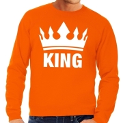 Oranje Koningsdag King kroon sweater grote maten voor heren. Op deze trui staat een grote witte kroon met daaronder het woord King. Materiaal: 50% katoen / 50% Polyester, 270 grams kwaliteit.…