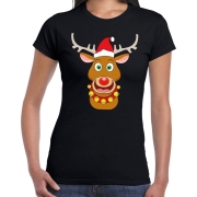 Foute Kerst t-shirt rendier Rudolf rode muts zwart dames XL -