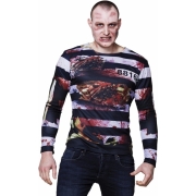 Heren shirt met zombie gevangene opdruk. Fotorealistisch zombie gevangene shirt met een opengereten borstkas met zichtbare ingewanden. Ideaal voor Halloween! Materiaal: 100% polyester. …