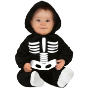 Zwart/wit skelet horror verkleed onesie voor baby/peuters. Zwarte jumpsuit met opdruk van een skelet/geraamte/botten. Materiaal: 100% polyester. Verkleedkleding/carnavalskleding/halloweenkostuum…
