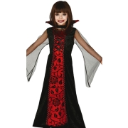 Rode vampieren verkleedkleding jurk voor meisjes. Mooie zwart/rode vampieren jurk voor meisjes met zwart doorzichtige lange mouwen, zwarte bloemen details op de voorzijde en op de hoge kraag.…