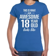 Awesome 18 year - geweldige 18 jaar cadeau t-shirt blauw dames. Op dit blauwe shirt staat groot de tekst: This is what an awesome 18 looks like. ken jij iemand die binnenkort 18 (achttien…
