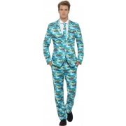 Heren kostuum hawaii print. Dit 3-delig heren kostuum met colbert, broek en stropdas heeft een all-over print van een tropisch eiland en zee. Voordelen van dit artikel …