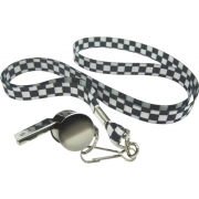 4x stuks fluitje Racing, scheidsrechter of Politie thema aan zwart/witte lanyard ketting. Zilverkleurig fluitje aan een zwart met wit geblokt lint. Kenmerken Materiaal:…