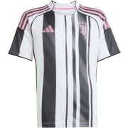 Kleur: Wit/Zwart Samenstelling: 100% polyester (gerecycled) Mouwen: Kort Pasvorm: Slim Details: Het Juventus 25/26 kinder thuisshirt combineert de iconische zwart-witte stijl met moderne roze details…