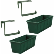 Set van 5 kunststof plantenbakken donkergroen rechthoekig 60 cm met 10 verstelbare railing beugels -