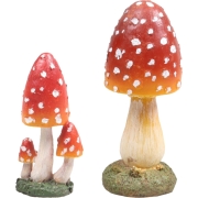 Decoratie paddenstoelen setje bestaande uit 1x vliegenzwam paddenstoel van 18 cm met brede hoed en 1x van 10 cm met 3 vertakkingen. Materiaal: polyresin. Herfst tuin/huis decoraties/versieringen…