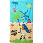 Strand/badlaken voor kinderen dierenprint 70 x 140 cm microvezel. De handdoek heeft een opvallend vrolijke print met verschillende dieren op het strand zoals een panda, nijlpaard, olifant, flamingo…