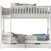 Stapelbed Scottie, geschikt voor twee matrassen van 90x200 cm. Gemaakt uit massief grenen en MDF. Inclusief lattenbodems en 2 lades. Specificaties • Kleur: Wit • Lengte:…