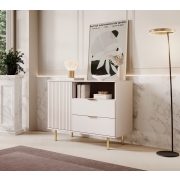 Dressoir Nicola is een opbergkast in moderne, hotelchique stijl. Het dressoir staat op hoge, goudkleurige pootjes.De kast heeft 1 deur en 2 lades. Deze openen met goudkleurige handgrepen.…