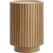 Ronde houten bijzettafel met verticale lijnen in het hout, perfect voor gebruik als tafeltje naast de bank Dit prachtige houten bijzettafeltje Kiyose combineert robuustheid met verfijnde…