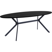 Artikelkenmerken Ovalen, ruime eettafel Stoer zwart stalen onderstel MDF tafelblad in matzwart H 75 cm x B 220 cm x D 100 cm De ovalen MDF…