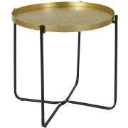 Ronde metalen bijzettafel voor buiten en binnen – goud met zwart onderstel, Dia 45 cm en 50 cm hoog. Deze stijlvolle ronde bijzettafel combineert een goudkleurig blad met een strak…