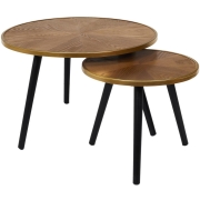 Geef je interieur een stijlvolle en warme touch met de Tiny bijzettafels/salontafels. Deze set van 2 ronde tafels combineert een robuust zwart houten frame met een elegant houten blad in het bruin…