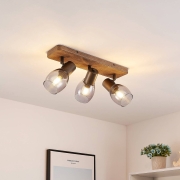 Plafondspot Ineska met drie lampenkappen van trendy rookglas Deze plafondspot springt meteen in het oog, want hij combineert warme houten elementen met licht gerookt glas. De rechthoekige…