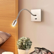 Glanzend chromen LED leeslampje Berfin met buigbare zwanenhals en schakelaar Berfin heeft een vierkante muurbevestiging met ingebouwde schakelaar en een glanzend verchroomd oppervlak, wat de leeslamp…