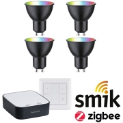 Met deze set bestaande uit vier smart Zigbee 3.0 LED RGBW-reflectoren met GU10-lampvoet, Zigbee 3.0 wandschakelaar en Zigbee 3.0 smik gateway verandert uw huis in een slimme woonruimte. Het Zigbee 3.…