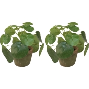 2x Kunstplanten mini pilea groen in oude ronde terracotta pot 13 cm. Deze groene pannenkoeken kunstplant heeft meerdere takjes met bladeren en wordt geleverd in verzwaarde pot. Formaat: 13 cm.…