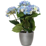Kunstplant/kamerplant Hortensia met volle bloemen in de kleur blauw, inclusief een bloempot van keramiek in het metallic zilver. Formaat plant: ca 40 cm hoog. Formaat bloempot: D15.5 x H13.5 cm.…