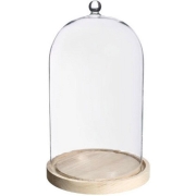 Decoratie stolp van helder glas op een houten plateau. Presenteer de mooiste dierbare schatten onder deze transparante stolp. Deze stolp is sierlijk afgewerkt met een knopje in de vorm van een…