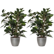 2x stuks groene ficus kunstplant 40 cm met plantenpot van keramiek in de kleur zilver metallic D13.5 en H12.5 cm. Zeer realistisch uitziende, onderhoudsvrije/onderhoudsarme kunstplant. Materiaal:…