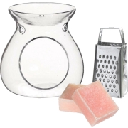 Deze set bestaat uit een geurbrander, mini rasp en 3x stuks amberblokjes/geurblokjes in de geur, sandelhout. Deze geur is warm, zacht en houterig. De geurbrander is van glas in de kleur…