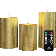 Stompkaars ribbel wax led 3d vlam op batterij met afstandbediening set van 3 d7.5h10/12.5/15 cm goud - Annas collection