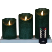 3ST OPLAADBARE KAARS ANTIEK GROEN WAX RUSTIEK BEWEGENDE VLAM 7,5X10/12,5/15CM MET INDUCTIE OPLAADSTATION EN AFSTANDSBEDIENING - Annas collection