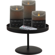 LED kaarsen/stompkaarsen 3x stuks grijs met zwart rond dienblad op poot van 22 cm. Rond zwart dienblad/kaarsenplateau van metaal inclusief een LED kaarsen set van 3x stuks LED stompkaarsen in de…