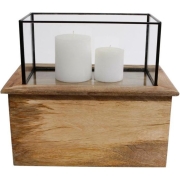 Windlicht met glas in lood 33 centimeter.Mango houten voet.Mooie rechthoekige glazen kom met zwart lood.Afmetingen ca. 38x23.5x33 cm. (bxdxh)Exclusief kaars…